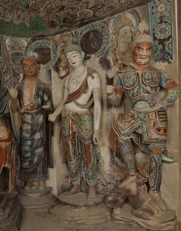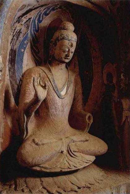第248窟的北魏坐佛,高92厘米,面部及衣服外來特征較明顯,薄衣透體如“曹衣出水”,造型已趨清秀型(中外因素的融合)。