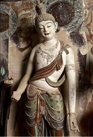 敦煌莫高窟第45窟的大勢至菩薩,此尊頭戴寶冠,發梳高髻,上身半裸,肌膚圓潤光潔,佩飾披巾、瓔珞、臂釧、手鐲等物,俊美中蘊含著女性的嫵媚。他目光低垂,神情專注,仿佛正在側耳聆聽朝拜者的傾訴。他是慈悲和善良的化身,是理想和藝術創作的完美結晶。